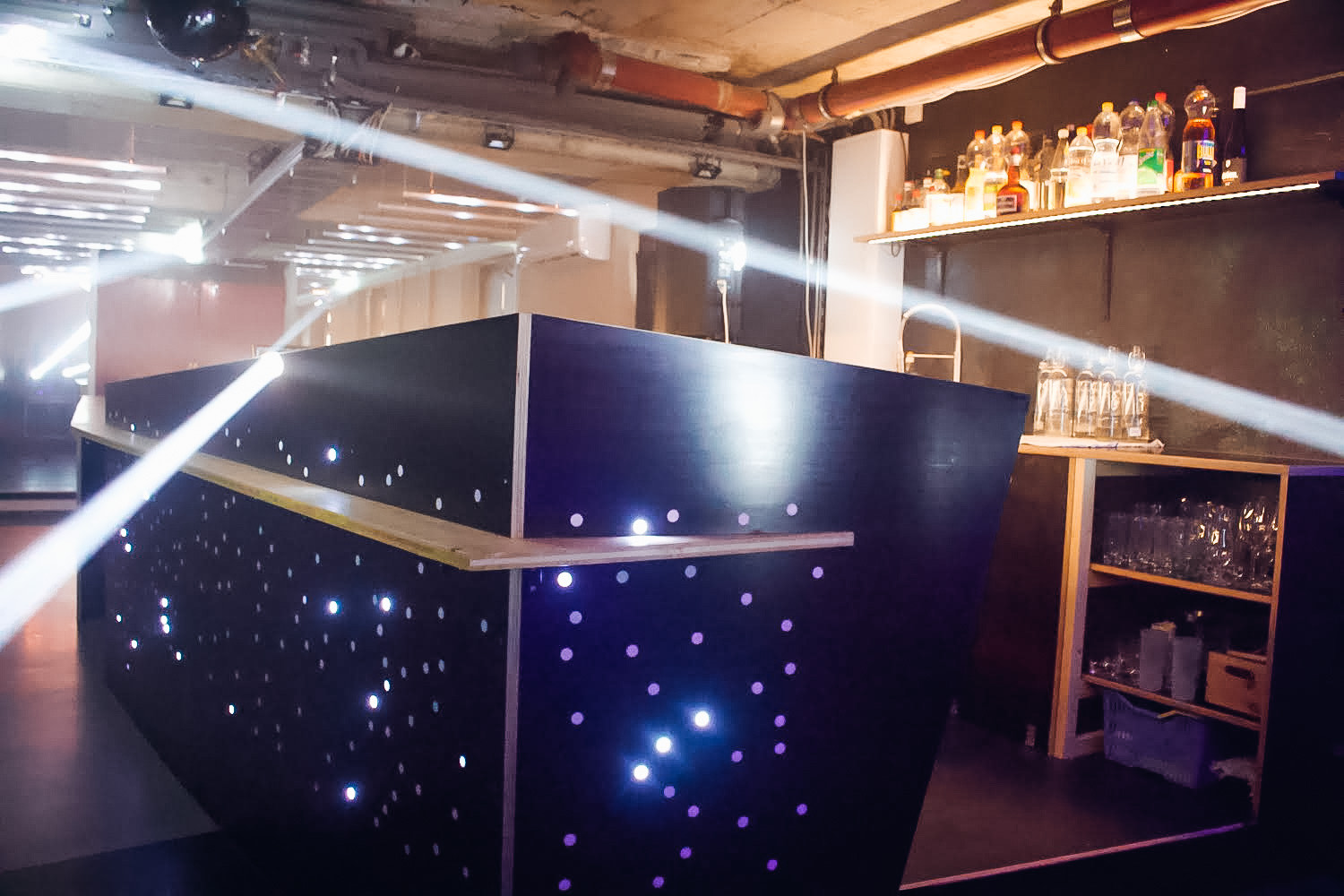 Das Darkspace ist bis zum MOTHERSHIP mit einer kleinen Nische aus Siebdruckplatten ausgestattet, welche die Zu- und Abwasserleitung zur BAR verdeckt und gleichzeitig die indirekte Beleuchtung beinhaltet.